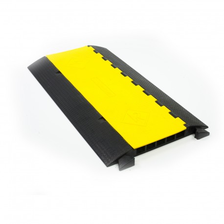 The Alustage CP-5 is a professional cable crossover, perfect for protecting cables in public areas, on stages, construction sites, or at outdoor events. Made from durable black polyurethane, it features an anti-slip surface for safe use. The crossover is equipped with five separate cable channels, each measuring 42 x 42 mm. Its solid construction can withstand a load of up to 8 tons, and the material is resistant to oils, acids, and gasoline. The product can be connected in a modular fashion to create longer protective lines. The black and yellow design and an opening yellow flap enhance its visibility and functionality.