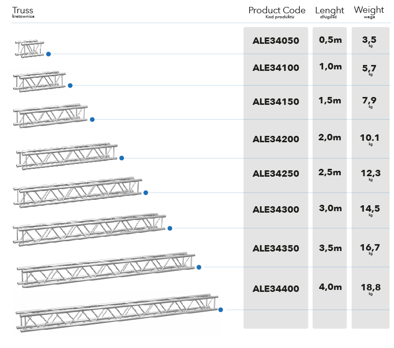 Designed for reliability, the ALE34 is a high-quality aluminum truss from the ALE series, featuring a 51×2 mm main tube and 16×2 mm braces. It’s strong enough for stage roofs and LED screen frames, yet lightweight enough for exhibition stands and decorative installations. The truss comes in lengths from 0.5 to 4.0 meters, and its performance is guaranteed by TÜV certification and thorough quality checks.