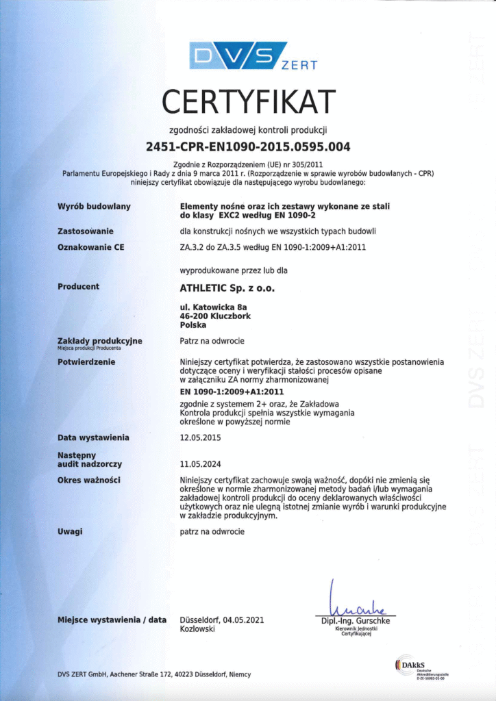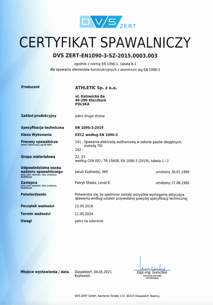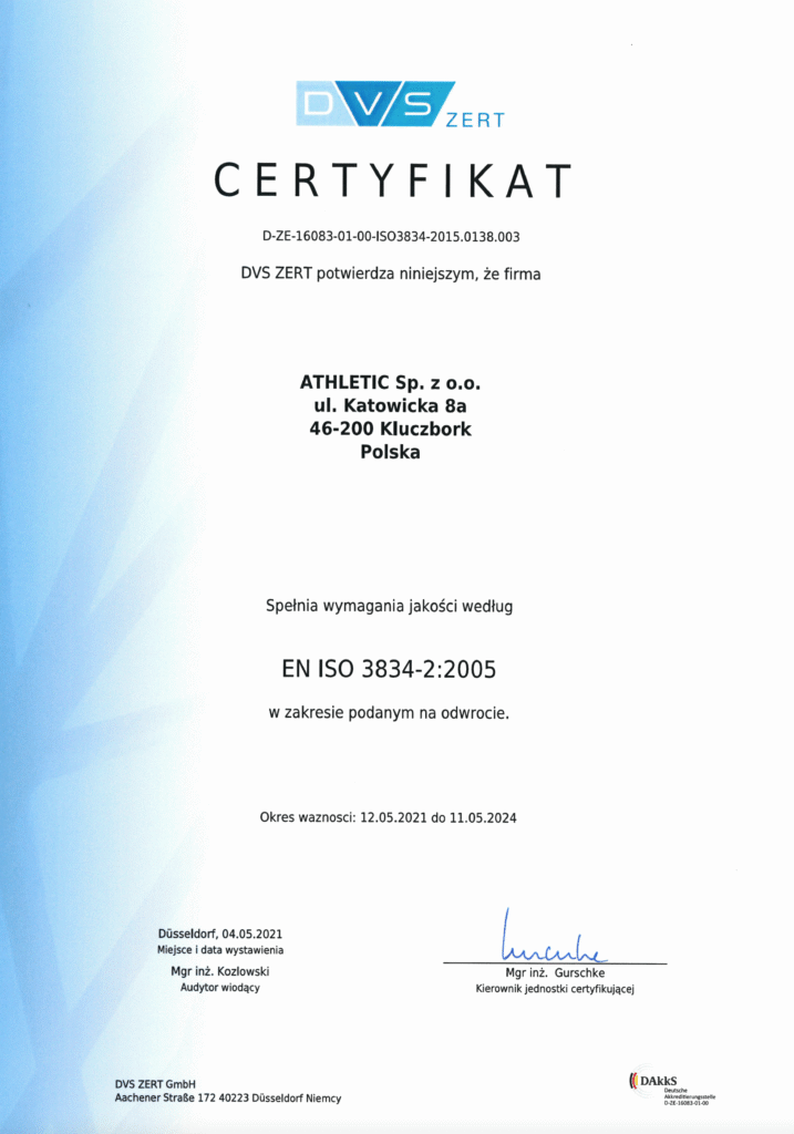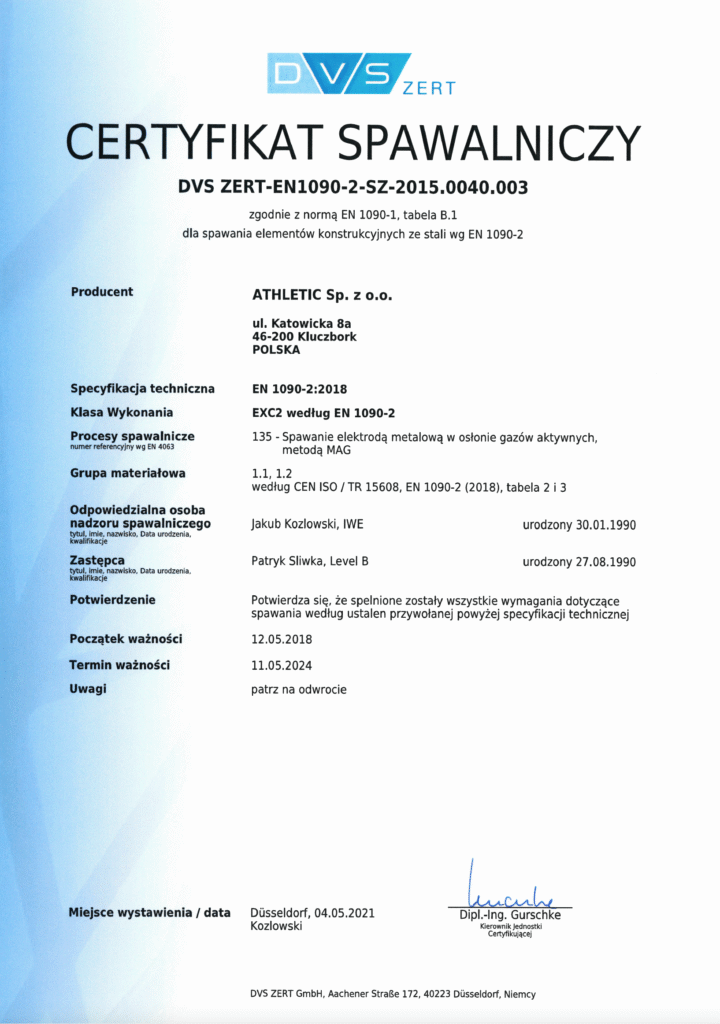 We hold the DVS ZERT certificate, which confirms the implementation and maintenance of a high-quality welding management system. This ensures that every weld in our products meets strict technical standards. We also conduct annual DVS audits and regular internal inspections to ensure the continued safety and reliability of our solutions.
