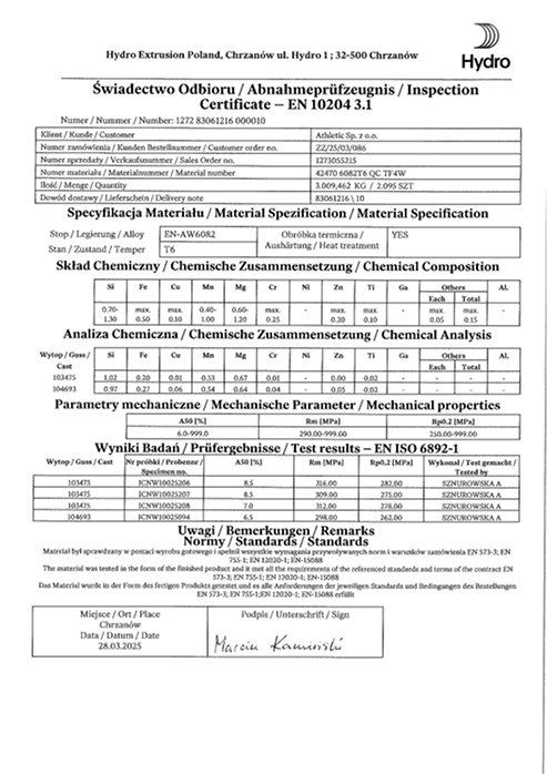 We use only certified 6082A T6 aluminium, known for its high strength and excellent corrosion resistance. As a result, our structures remain durable and safe, even under intensive use.